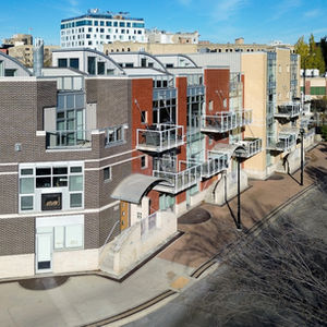 Welcome to Ship Street Condos! This spacious townhouse condo offers stunning modern finishes and incredible natural light throughout. The main floor features a bright open concept with custom floating concrete staircase. Living Room with floor-to-ceiling windows two-sided gas fireplace overlooking Waterfront Dr. Open concept Kitchen/Dining Room with ample cupboard and counter space, and high-end appliances including a Wolf dual fuel range and GE Cafe 4-door fridge. Main floor laundry and powder room. Two Bedrooms and 2 washrooms on the second level. The Primary Bedroom boasts a curved feature wall and 4-piece en-suite with standalone shower and tub. Second Bedroom with gas fireplace, 3-piece en-suite, and private balcony overlooking Stephen Juba park. The third floor provides access to the panoramic rooftop deck with over 600 square feet of outdoor space overlooking the Red River and downtown Winnipeg. Secure parking in the oversized, heated double garage on the main level with access to the private elevator (shared with next-door neighbour). Heated throughout with hydronic in-floor heat, with supplemental forced air heating and A/C. Located on the South corner with East, South, and West exposure.
